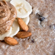 Rinse the grains. In a saucepan, combine the milk and water, add the sugar, stir, and bring to a boil. Add the spelt and simmer on low heat for about 30 minutes until thickened. In the last minute, add a teaspoon of vanilla extract and cook down to the desired thickness. Remove from heat, stir in a tablespoon of raisins, and transfer to a warm plate. Serve with whole almonds, banana slices, and almond butter to taste.