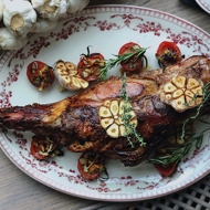 Using a knife, make small slits in the tender parts of the leg (six slits in total) and place half a clove of garlic in each one.