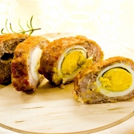 Divide the meat mixture into 4 portions. Wrap each portion around 1 hard-boiled egg. Seal tightly.
