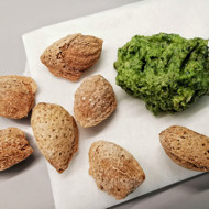 This pesto recipe results in a very rich flavor. It's important to taste the pink pepper and black sesame seeds beforehand, as they can be quite hard - in this case, it's better not to add them.