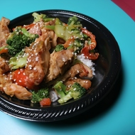 Spicy Chinese chicken stir-fry with broccoli, bell peppers, and cucumber.