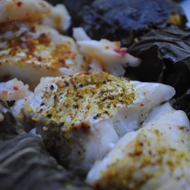 Sprinkle each piece with spices, salt, and pepper (to taste and discretion), and wrap in a grape leaf.