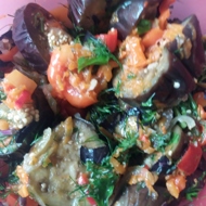 Combine the cooled eggplants and sautéed vegetables in a deep bowl. Mix the vinegar, sugar, and salt, stir, and pour over the vegetables, adding the remaining vegetable oil.