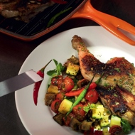 Sauté the chicken in a grill pan with vegetable oil for about twenty-five minutes, until golden brown, turning occasionally. Serve with roasted vegetables, and use grilled chili peppers as a garnish.