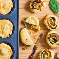 Another option: Roll out the puff pastry into a rectangle 20x30 cm. Evenly spread the filling and carefully roll it into a log. Cut into 12 equal pieces. Place them on a baking sheet lined with parchment paper, brush the tops with olive oil. Bake for approximately 30 minutes in a preheated oven at 356°F.