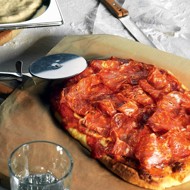 Grease the bottom of a small baking dish with olive oil and evenly spread the pizza dough, taken out of the fridge, over it. Let it sit in a warm place for fifteen to twenty minutes (underrisen dough will simply not be ready, and there is a risk of it burning, while over-risen dough may stick to the dish), and then pre-bake it in an oven preheated to 482°F for five minutes.