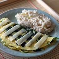 Heat a skillet and pour in the lightly beaten eggs. Cook for 2 minutes, then sprinkle the spinach mixture on top and cook for another 1-2 minutes until the eggs are set.