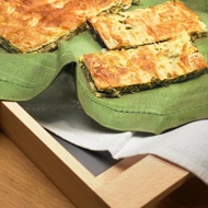 Roll out the dough into two thin sheets to fit the size of the baking tray. Place one sheet on the bottom of the tray and evenly spread the cheese mixed with spinach and onion on top. Season with salt and pepper (the salt is optional, as feta cheese is quite salty on its own).