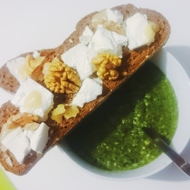 For the tartines, spread the bread with feta cheese, then top with dollops of honey and walnut quarters.