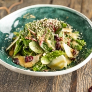 Garnish the salad with slices of pear, nuts, dried cranberries, green onion, and watercress. Drizzle with the remaining dressing on top.