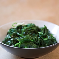 Chop the spinach finely and add it to the skillet. Cover and cook for 4–5 minutes until the leaves are slightly wilted. Transfer to a metal bowl, season with salt and pepper. Top with garlic and serve with lemon wedges.