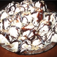 Then, randomly place the pieces on the cake to resemble ruins. Drizzle the remaining sour cream over the cake.