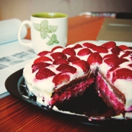 Add raspberries (you can use any other fresh berries). Spread cream on the top layer as well and cover it.