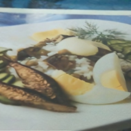 In a salad bowl, layer the rice, sliced cucumbers, eggs, and drizzle with mayonnaise. Garnish the salad with the remaining sprats and herbs.