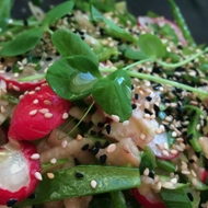 In a salad bowl, combine the radishes, peas, and green onion. Toss well and drizzle with the dressing.