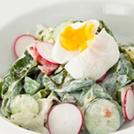 In a large bowl, combine the salad leaves with radishes, pieces of bell pepper, and onion. Season with salt, pepper, and sour cream. Mix well and serve on individual plates. Top with poached eggs.