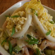 Serve in bowls, placing three rings of squid on top, filling the centers with chopped egg, and carefully drizzling with dressing. Sprinkle with green onion and garnish with lemon zest.