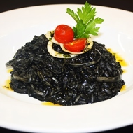 In olive oil, sauté finely chopped shallot for 2-3 minutes, add the rice and sauté for another 4-5 minutes, deglaze with white wine, let it evaporate, then add fish stock and squid ink. Cook the rice for 8-10 minutes, stirring occasionally. Separately, sauté the squid with finely chopped garlic in olive oil, combine with the rice, mix, season with salt and pepper.