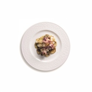 Heat two frying pans. Sauté the squid and artichokes separately in olive oil. Season lightly with salt and pepper, being careful not to overdo it. Cook the ingredients gently as well. The squid should be cooked for no more than 30 seconds; otherwise, it will become rubbery in texture. You should spend about the same amount of time on the artichoke.