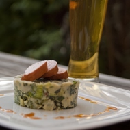 Gradually add the chopped endive to the hot puree until the potatoes absorb all 450 grams. Strain the reduced wine. Remove the sausage from the packaging and slice it into rings.