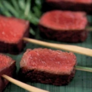 Remove the finished steaks from the grill, cut them into small pieces, skewer each piece, and serve with fresh cress salad. Enjoy your meal!