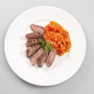 Arrange the sliced steaks beautifully on the plates, with five to seven pieces per serving, along with the sautéed onions and tomatoes. Drizzle the meat and vegetables with a small amount of olive oil and garnish the dish with a sprig of fresh mint.