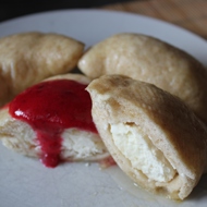 Divide the dough into 2 parts. Roll each part into a sausage shape with a diameter of 2.5–3 cm. Cut into pieces about 2 cm long. Roll each piece with a rolling pin into a circle about 0.5 cm thick. Place a teaspoon of cottage cheese in the center. Pinch the edges together with your fingers.