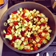 In a heated skillet, pour in the olive oil and add the vegetables in the following order: leek, carrot, zucchini, bell pepper, and cherry tomatoes. Add salt. You can add garlic at the end. Stew for about 20–25 minutes.