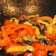 In a preheated wok, pour in sesame oil and start sautéing the mushrooms, stirring vigorously. As soon as the mushrooms begin to brown, add the sliced peppers and continue to cook until the peppers are tender.