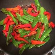 Add the whole sugar snap peas (it's better to use almost flat Kenyan peas for this dish rather than seasonal thick ones) and the sliced red pepper.