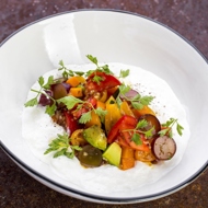 Place the stracciatella on a plate, then top it with the dressed vegetables. Season with salt and pepper, and drizzle with olive oil.