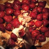 Spread the mascarpone over the cooled dough, then top it with the marinated strawberries.