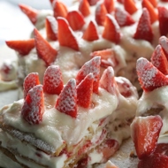 Decorate the top layer of whipped cream with strawberry slices and sprinkle with powdered sugar.