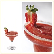 Prepare the crushed ice. To do this, place ice cubes between two cloth towels and crush them as finely as possible using a meat mallet or rolling pin. Add the ice to the other ingredients and blend until it reaches a frozen puree consistency. Quickly distribute it into the chilled glasses and serve, garnished with strawberries.