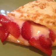 When the eggs are almost cooked, place the cheese on one half of the omelette, sprinkle with sugar, and add the strawberries. Fold the omelette in half and cook for another 2 minutes with the lid on.