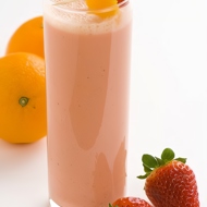 In a blender, combine strawberries, yogurt, orange juice, and milk.