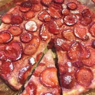 Beat the butter together with 150 grams of sugar and 3 eggs. Add vanilla, baking powder, and flour, continuing to beat the mixture. Pour the batter into a buttered baking pan and smooth it out. Chop the strawberries slightly (I cut them into quarters) and place them on top of the batter, gently pressing them in.