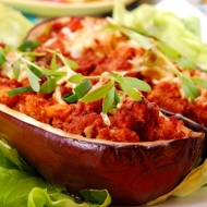 Wash the eggplants. In heated vegetable oil, fry the eggplants on all sides. Let them cool slightly, cut them lengthwise, and scoop out half of the flesh.