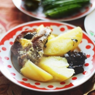 In this recipe, I used a part of the pork leg. It was a nice piece of fillet that I sliced into pieces. Ideally, you can freeze it a bit to make it easier to cut. There is no need to pound the meat! A vegetable side dish and sweet potatoes pair well with this.