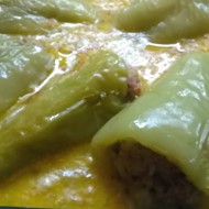 While the sauce is cooking, mix the minced meat with the rice and grated garlic, and tightly stuff the peppers. I did not add salt to the filling.