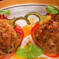 On each piece of pepper, place 2 tablespoons of grated cheese and top with the meat. Sprinkle with the remaining cheese and drizzle with sauce (see note). Bake for 15 minutes. Serve topped with cilantro and the remaining sauce.