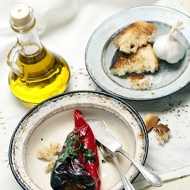 In a bowl, mix the olive oil, vinegar, and minced garlic. Season with salt and pepper. Drizzle over the peppers and let sit at room temperature for 1 hour.