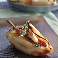 Make a T-shaped cut along the length of each pepper, ensuring the top bar of the T is near the stem (do not cut off the stem). Through this cut, carefully remove the seeds and stuff each pepper with the tomatoes, herbs, and garlic, trying not to break the pepper.