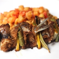 Coat each fish in the mixture. Use the same mixture to fill the inside of the sardines and roll them up. Thread the rolls onto skewers, alternating with bay leaves and lemon wedges. Place on a baking sheet or grill surface, drizzle with olive oil and lemon juice. Bake in a preheated oven at 356°F for 15-20 minutes.