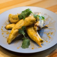 Coat each pepper in potato starch; this helps the batter adhere better to the peppers later. Gently shake off the excess starch by tapping the peppers against the surface of the table or cutting board.
