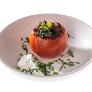 Stuffed tomatoes are a beautiful and festive hot appetizer. The combination of a cheesy filling made from meat and beans with a hearty tomato shell is filling, healthy, and very eye-catching. A great recipe for a holiday table.