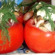 Cut off the tops of the ripe small tomatoes, scoop out the pulp and seeds, and fill them with the mushroom filling. Garnish with herbs.