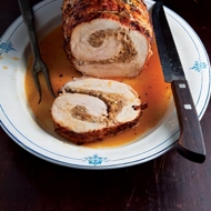 Remove the log from the oven, transfer it to a serving platter, and let it rest for 20 minutes. Cut off the twine, slice, and serve.