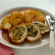 Place the stuffed meat in a baking dish greased with olive oil, arrange the vegetables around it, and pour in the broth and wine. Season with salt and pepper and place in the oven for 1 hour until cooked.
