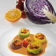 Grease a baking tray, arrange the stuffed vegetables on it, and lightly sprinkle each with breadcrumbs. Place in a preheated oven at 428°F for seven minutes.